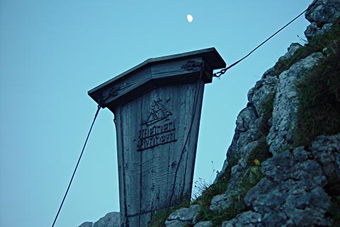 Der Bergsteiger wandert am Purtschellerhaus vorbei bis zum Eckerfirst (1785 m) zur ersten Felsstufe. Von dieser Felsstufe aus sehen Sie rechts das Kehlsteinhaus und links unten den „Wildfreihof“.