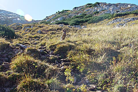 Nachdem wir noch einen langen Weg vor uns haben lassen wir die Mitterkaseralm links liegen und gehen den Weg hinauf auf den Rücken des Jenner und orientieren und nach Links in Richtung Carl von Stahlhaus.