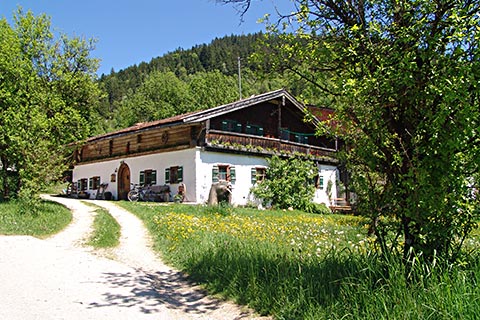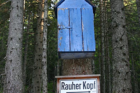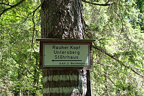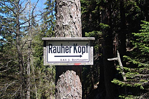 Nach dieser Beschreibung beginnt die Wanderung am Naturbad Aschauerweiherbad. Vom Parkplatz des Naturbad Aschauerweiherbad geht der Bergsteiger zunächst Richtung Bischofswiesen. Wenn der Wanderer bzw. Bergsteiger schon hinab Richtung Bischofswiesen geht, findet er einen Wegweiser nach rechts zur Kastensteinerwand. Der Bergsteiger folgt diesem Wegweiser und geht der Asphaltstraße entlang zwischen einigen Häusern und etwas später steil auf der Straße den Wald hinauf. Kurz bevor der Bergsteiger Bergsteiger die Berggaststätte Kastensteinerwand Alm erreicht, muss er nach rechts auf einen Forstweg einbiegen. Diesen Forstweg entlang geht es nun steil nach oben bis zu einer Rastbank und dem so genannten "Blauen Kastl". Hier biegt der Wanderer bzw. Bergsteiger nach rechts ab und nun geht es einige Zeit einen gut begehbaren Waldweg weiter nach oben zum rauhen Kopf.