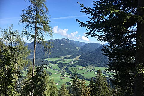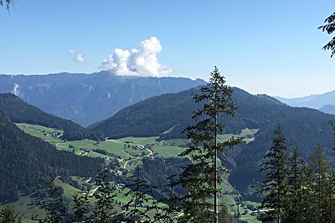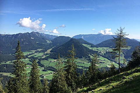 Ein weiterer Punkt für diese Bergtour früh aufzubrechen ist der Sonnenstand. Am Morgen wird die gegenüberliegende Seite von der Sonne erfasst. Für Fotografen ein sehr guter Moment um einen Schnappschuss aus dem Urlaub an die Daheimgebliebenen zu senden. Von der Schärtenalm sieht man in das Bergsteigerdorf Ramsau und hier in das Hochschwarzeck, Hirscheck, den Toten Mann und die Deutsche Alpenstraße. Diese ist gerade bei Motorradfahern und Autowanderern sehr beliebt.