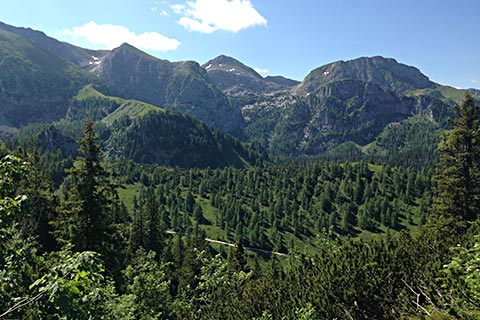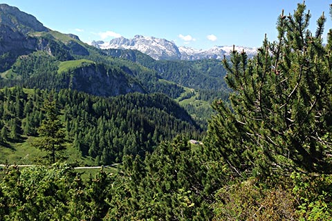 Sie biegen links in die Forststraße ein und folgen dieser. Beim Blick nach links sehen Sie den Kehlstein mit dem Kehlsteinhaus, den Hohen Göll und das Hohe Brett. Rechts um die Kurve rum und Sie sehen links unten einen Kaser. Ortsansässige nennen diesen „Klausmaxei“. Hier lohnt es sich auf eine gute Brotzeit einzukehren. Von hier aus können auch die zuvor benannten Berge bestiegen werden.
