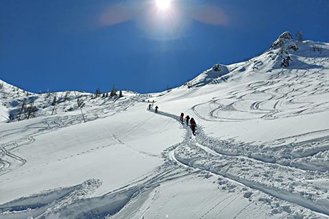 Technisch einfache Tour, Konditionell anspruchsvoll. Abfahrt über Skipiste, alternativ über Aufstiegsspur möglich (gute Skifahrer). Aufstieg ca. 2,5 – 3 Stunden
