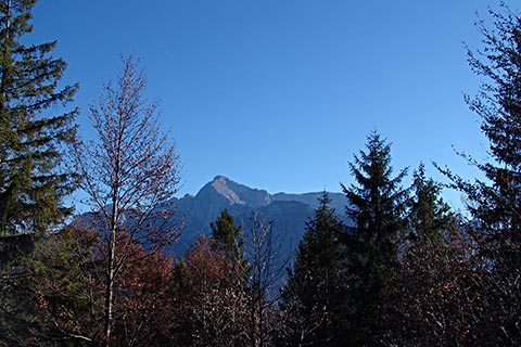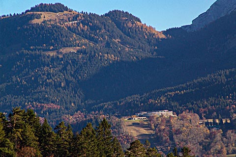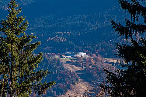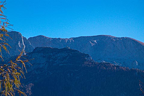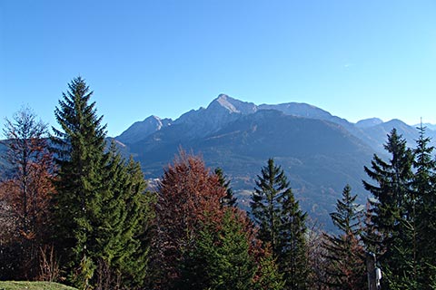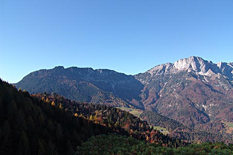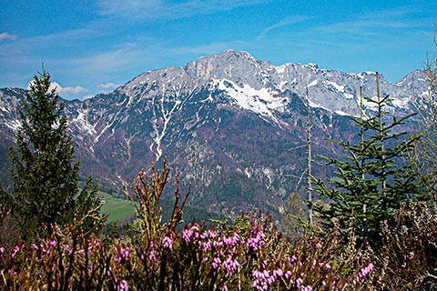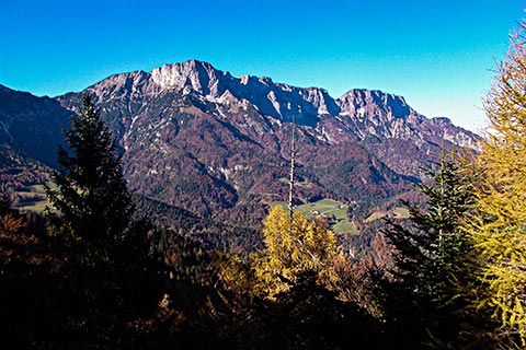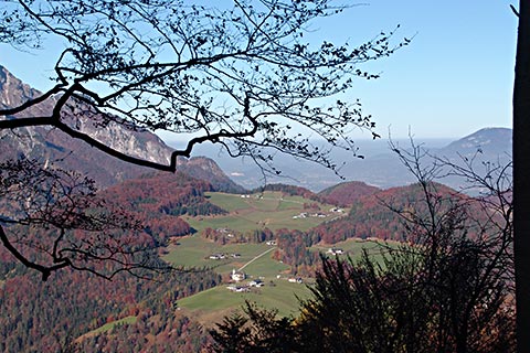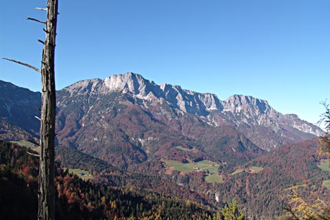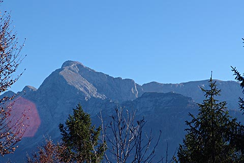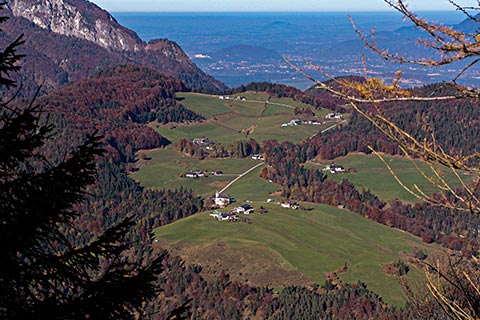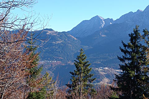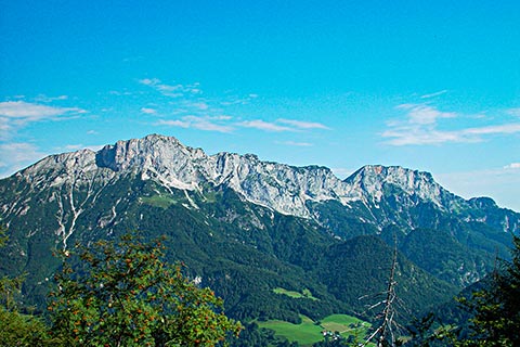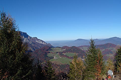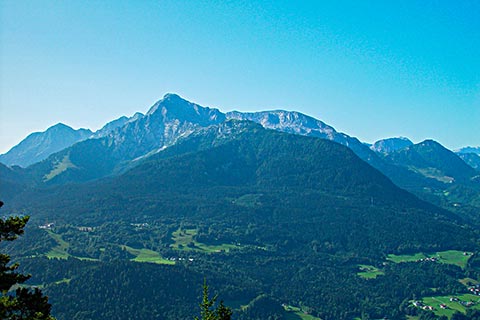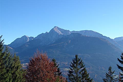 Der Weggabelung nach rechts folgend erreicht der Wanderer den Aussichtspunkt Marxenhöhe mit einzigartigem Blick auf den Ort Markt Berchtesgaden. Diese Route ist etwas länger! Die hier beschriebene Route folgt noch einige hundert Meter der Asphaltstraße. Jetzt geht’s quer über einen Parkplatz zum Weg auf die Kneifelspitze. Dieser Wanderweg ist gut ausgebaut und führt später über Serpentinen weit hinauf in Richtung der Gaststätte (Paulshütte) auf dem Gipfel der Kneifelspitze. Knapp unterhalb des Gipfels enden die Serpentinen und der Fußweg mündet in die Fahrstraße zur Versorgung der Gaststätte. Nun ist es nicht mehr weit und das Ziel, die Kneifelspitze mit den zahlreichen Aussichtspunkten ist erreicht.