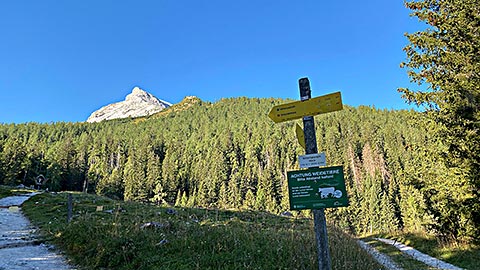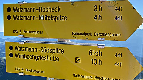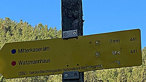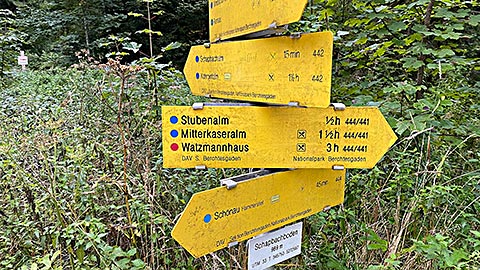 Wir lassen bei der Weggabelung die Schapbach-Diensthütte (mittlerweile leider verfallen) links liegen und gehen an der Kreuzung halb rechts Richtung Stubenalm / Watzmannhaus. (rechts abwärts geht es zur Wimbachbrücke / Ramsau). Zuvor informieren wir uns noch an der Infotafel über die Wandermöglichkeiten direkt am Watzmann.
