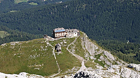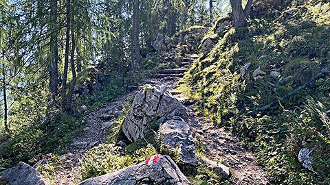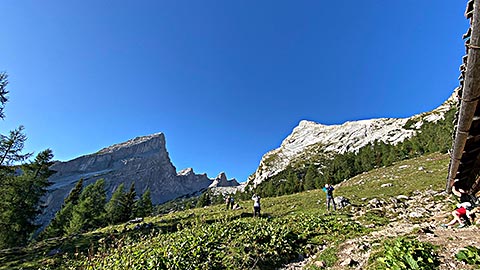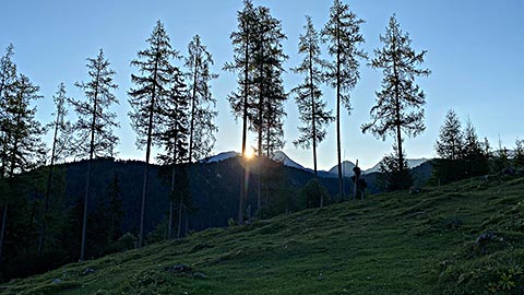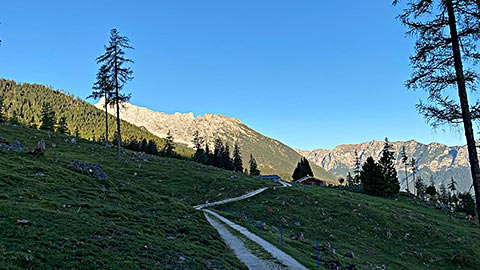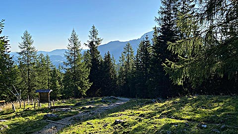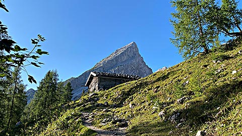 Frisch gestärkt verlassen wir die Mitterkaseralm und gehen weiter durch den Wald Richtung Watzmannhaus. Vorbei an der Forsthütte und der Materialseilbahn erreichen wir die Falzalm. Auf der Falzalm breitet sich die ganze Pracht des Berchtesgadener Talkessels für den Wanderer aus. Vor uns auf einem Grat steht majestätisch das Watzmannhaus und wir denken uns: "nichts wie hin zum Watzmannhaus".