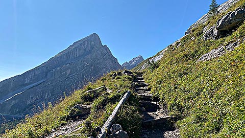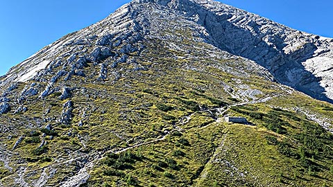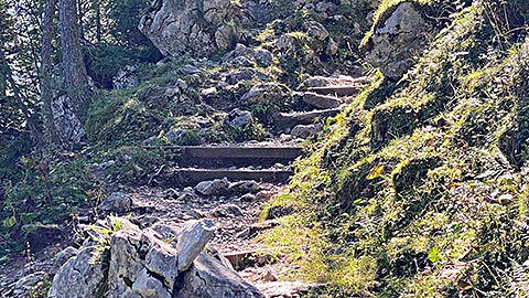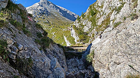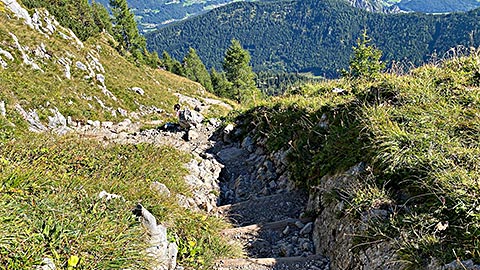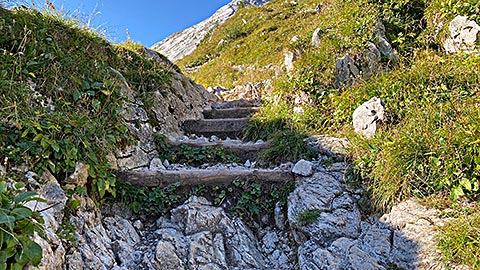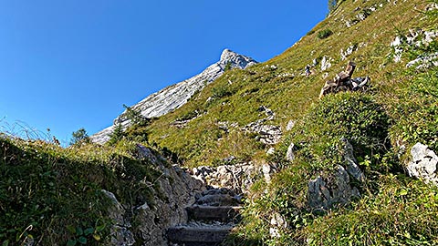 Gut gestärkt machen wir uns auf den Weg zum letzten Anstieg der heutigen Tour. Der Weg vom Watzmannhaus ist recht breit und führt serpentinenförmig den Felsrücken hinauf. Je höher man steigt, desto schmäler und felsiger wird der Weg, der zum Teil mit Seilsicherungsanlagen ausgestattet ist. Jetzt merkt man erst wie hoch und steil der Watzmann überhaupt ist.